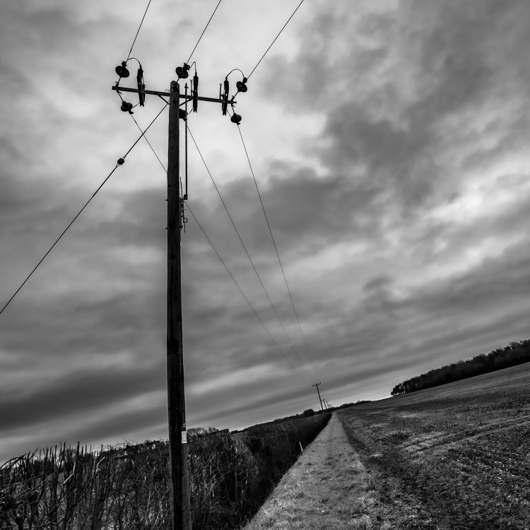 This telegraph pole is bent over at an angle that on it’s own merits very little interest. When I decided to try and make the images have an unsettling look I quickly realised that by straightening the pole the horizon will slant which together with the lines radiating off at all angles from the field and pole give the effect I wanted.
