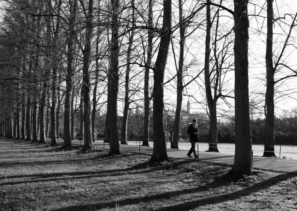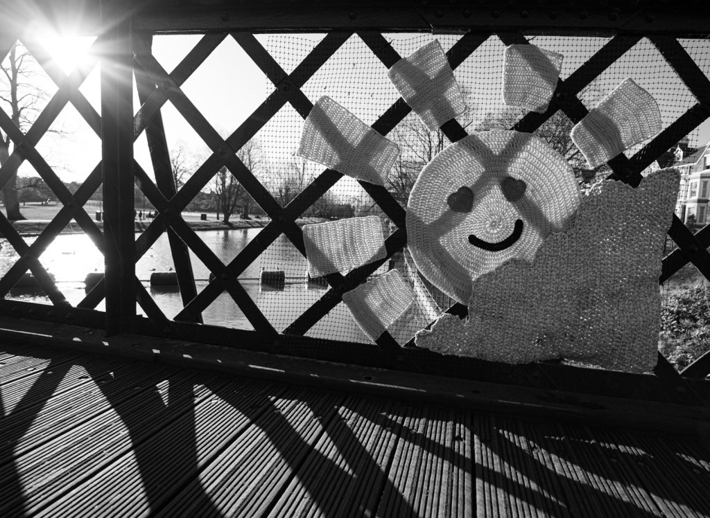 A useful reminder that changing the height of a shot makes a big difference. I knelt down to take this on a footbridge in Cambridge because someone had hung a bright crochet on it and I wanted the sun shining behind as a counterpoint and on framing the image noticed the fantastic lines and shadows being created. The sun helpfully bright enough to silhouette the bridge. Behind the main image you could argue there is some depth being created by the river banks.
