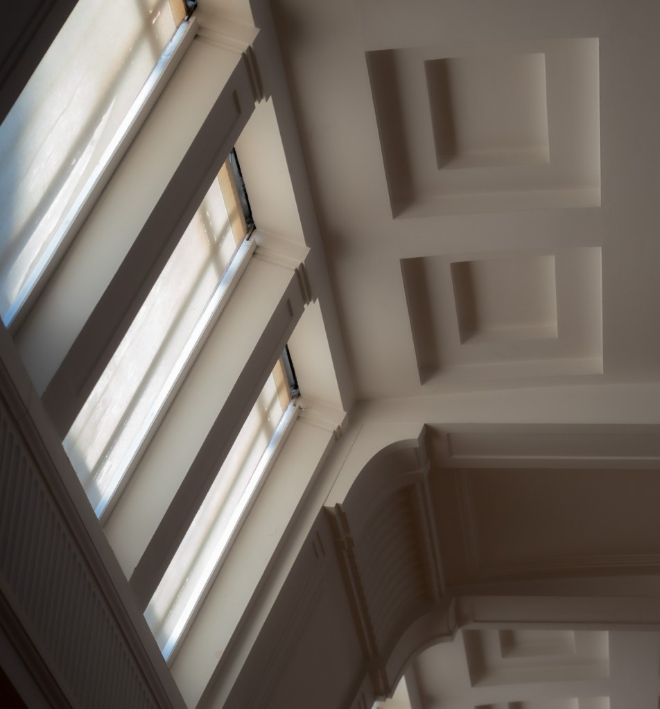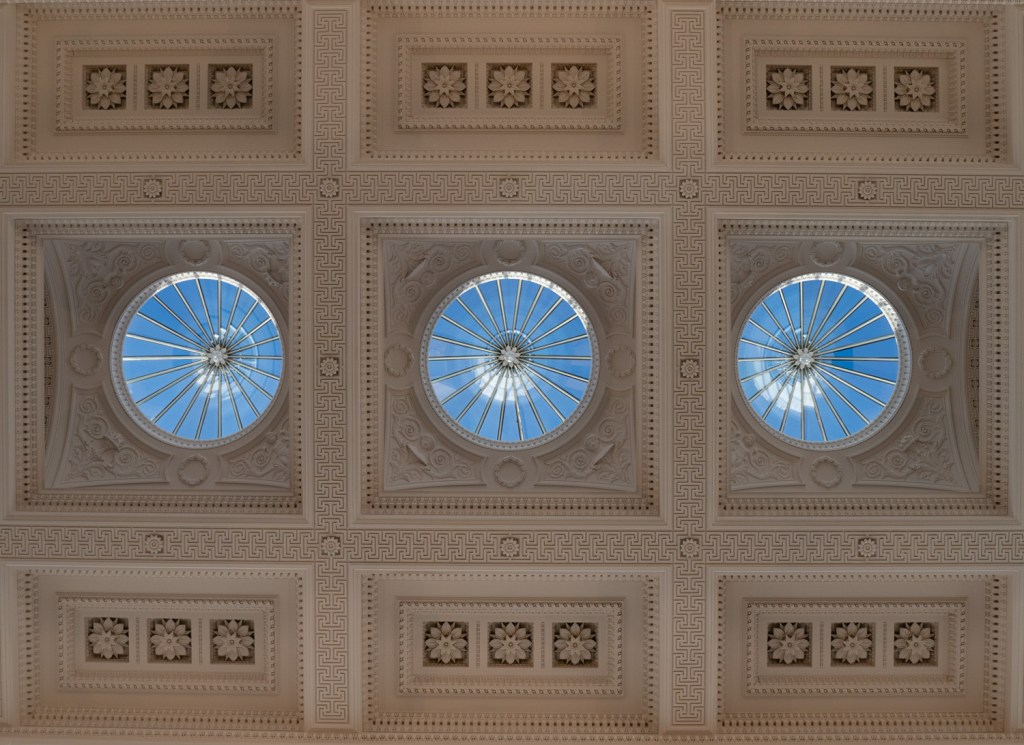 Neck ache. A very ornate ceiling but I loved the completely blue sky that punches holes through it – a winning noughts and crosses line.