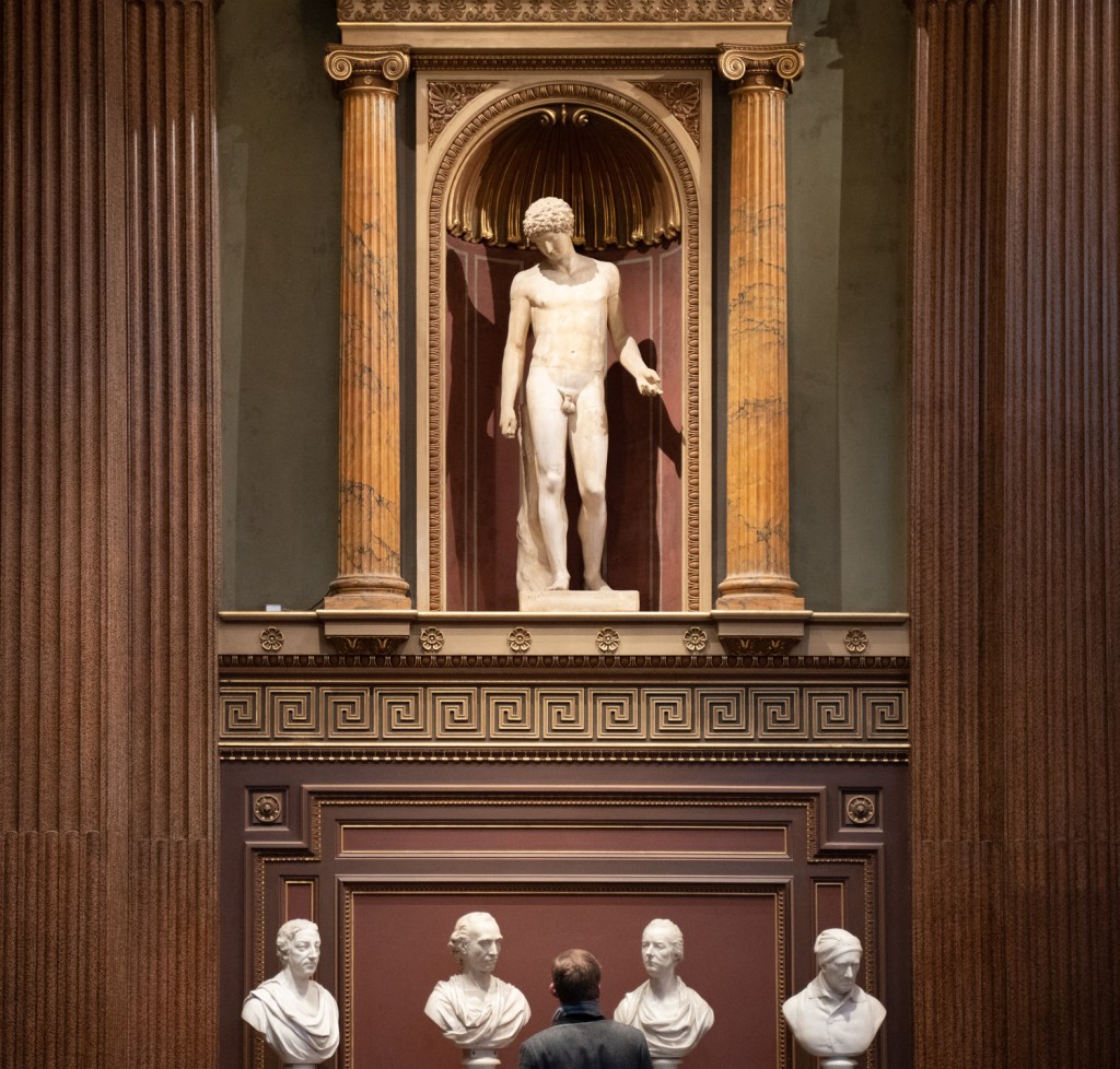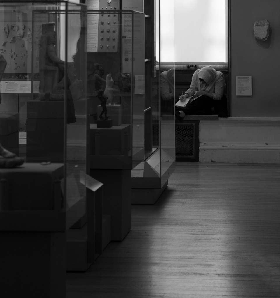 A subtle leading line from the display cases draws you towards the lady deep in thought.