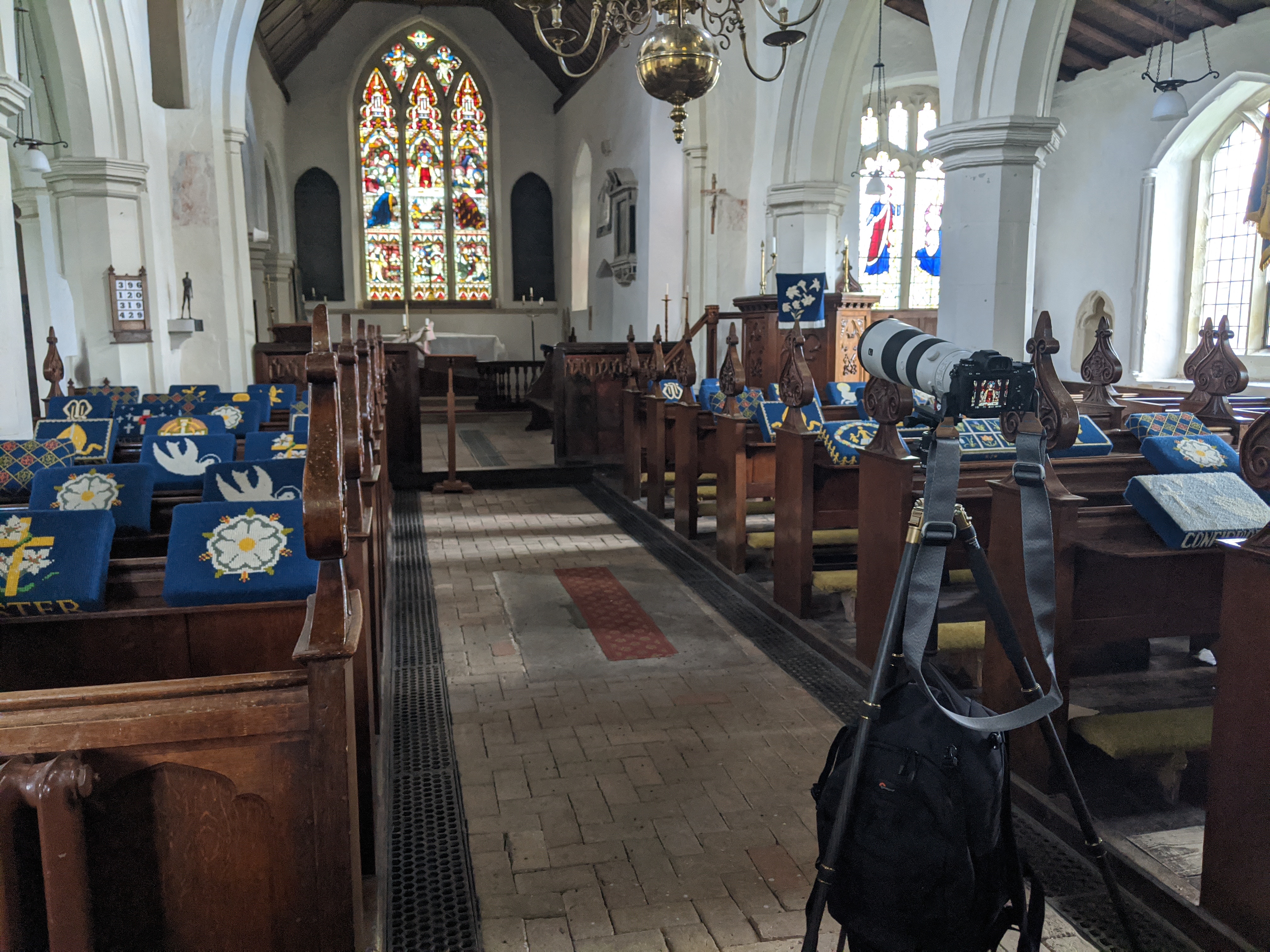 It’s funny how familiarity can blind you. A location you know completely is no longer looked at or observed but forms just a part of the background of your daily life. The church you dummy! I walk past one of the two churches in our village pretty much everyday but hadn’t once thought about going inside to take pictures – a quick check with the church warden thats it would be ok under lockdown and I was in. I knew the location would present challenges and so a tripod was a must. I also knew that I wanted the shots to be continuous so I needed to set up for the 600mm zoomed shot and then check the 14mm shot and those in between still worked. Once happy with the set up I also decided that I would take three bracketed images to include as much tonal information as possible and then pull them together in a package i use occasionally called Aurora HDR. HDR has been massively overused in recent years and can look distinctly ugly but if used subtly can really help in locations with tricky lighting where you want as much information as possible.