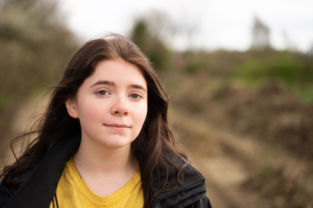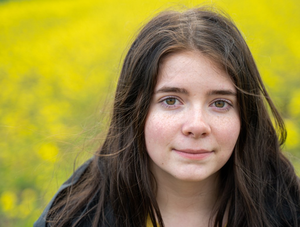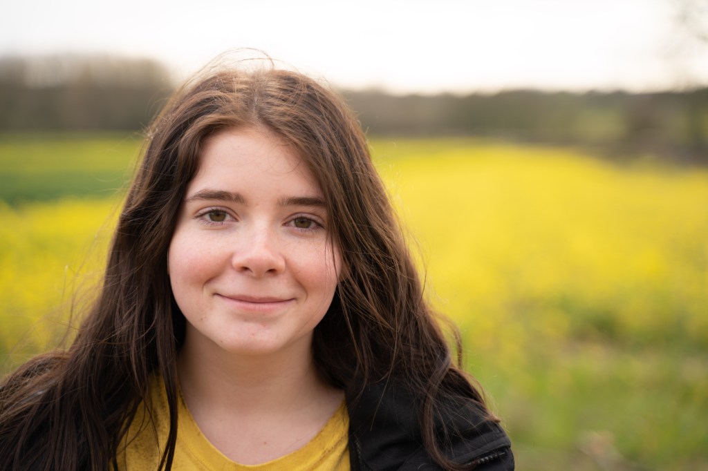 Better! The subject is in focus and the background gives enough interest and contrast and adds to the image rather than interfering. The colours give a nice balance to the portrait. Despite being completely unrecognisable individually the elements of the background would still most likely be identified as a field of flowers which I think is important to give context – perhaps f3.5 would have worked better than f2.8.