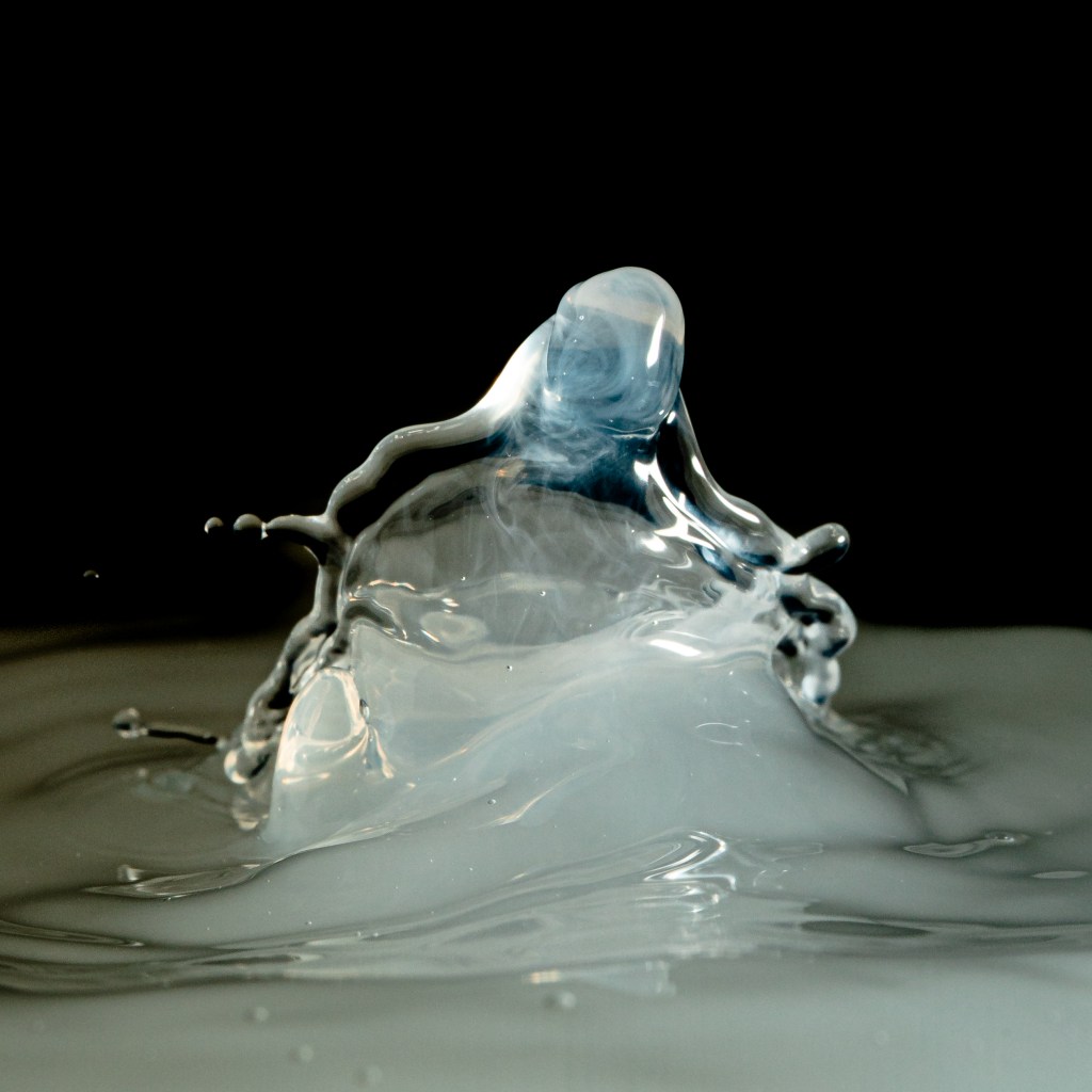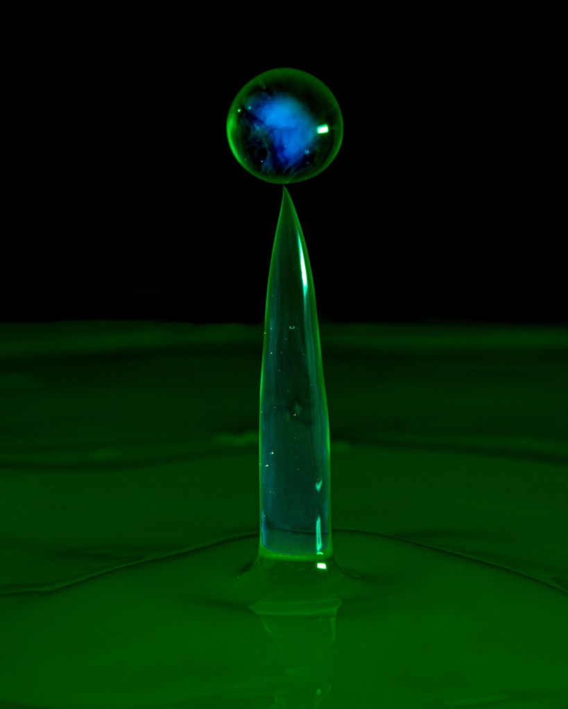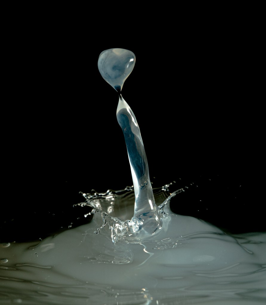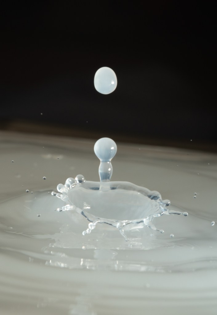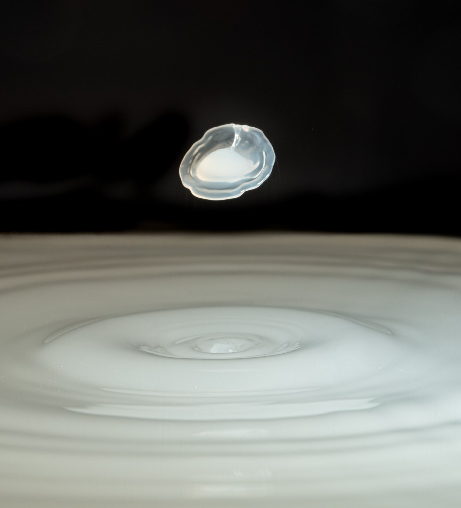 I experimented with drops onto solid surfaces (As in the Milk Drop Coronet image) and also into water baths. I tried adding milk which helps with viscosity and drop shapes but a real pro would add xanthan gum – another day maybe.