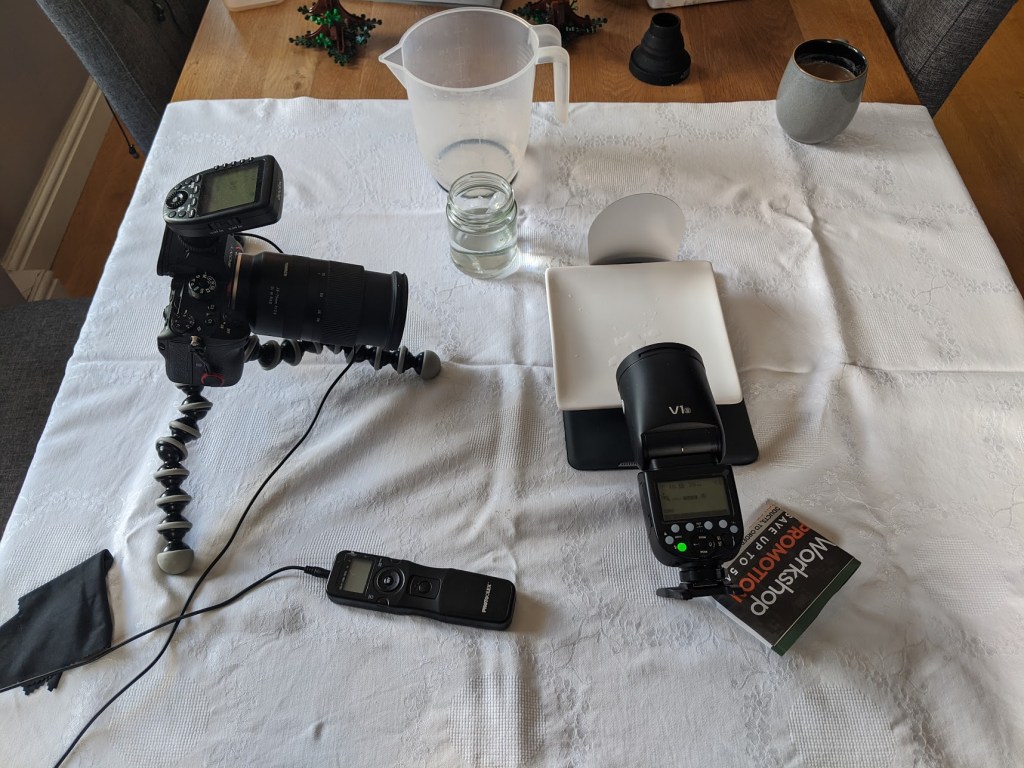 All timing of water drops and firing of flash was manual and by eye though I did use a remote release shutter which helped (before it went wrong) and then I resorted to manual. The flash was set to it’s lowest power setting (1/128) which means the flash is on/off very quickly enabling the fastest freezing of motion – certainly comparable with technical failures at 1/8000 sec with TTL flash.