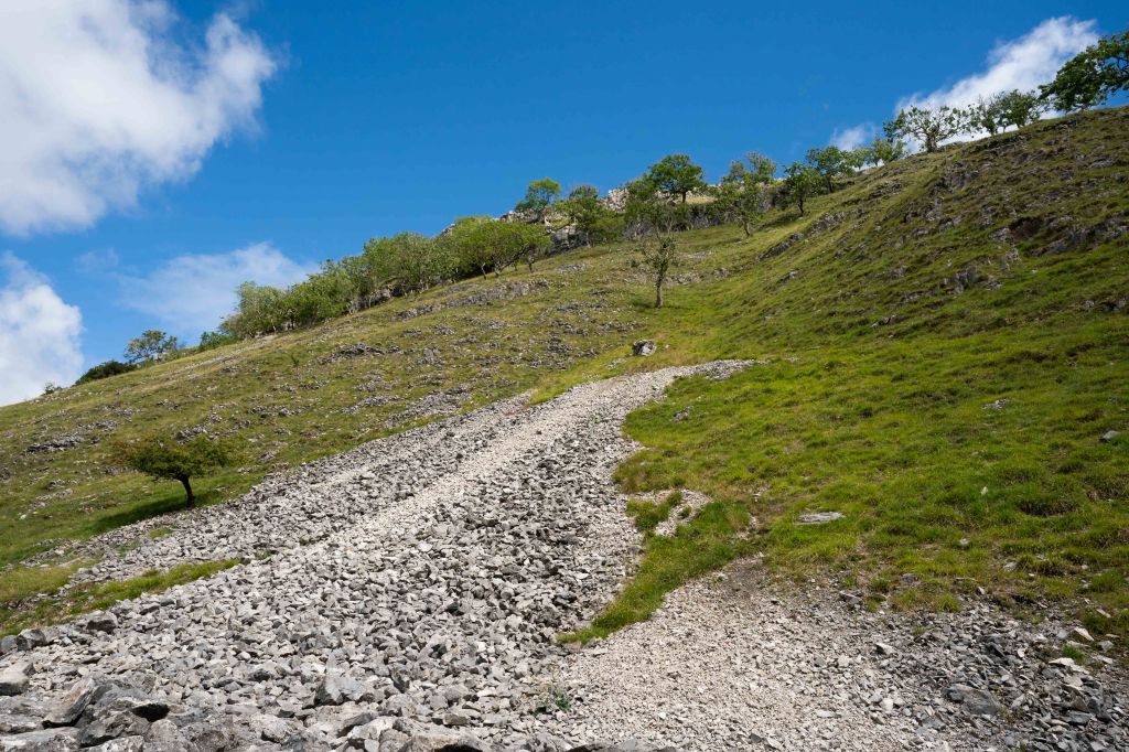 As I came to the small scree I looked up briefly and saw a scene that I wanted to photograph for this exercise. Looking back at the rocks I slowly followed the scree to the first tree on the left and then slowly upwards until the scree ended at the rock and then onto the next tree, the natural lines lead me up until I am looking at the top of the tree lined hill where the blue sky meets the ridge. I then took in the whole scene for a second or two in the viewfinder and took the shot.