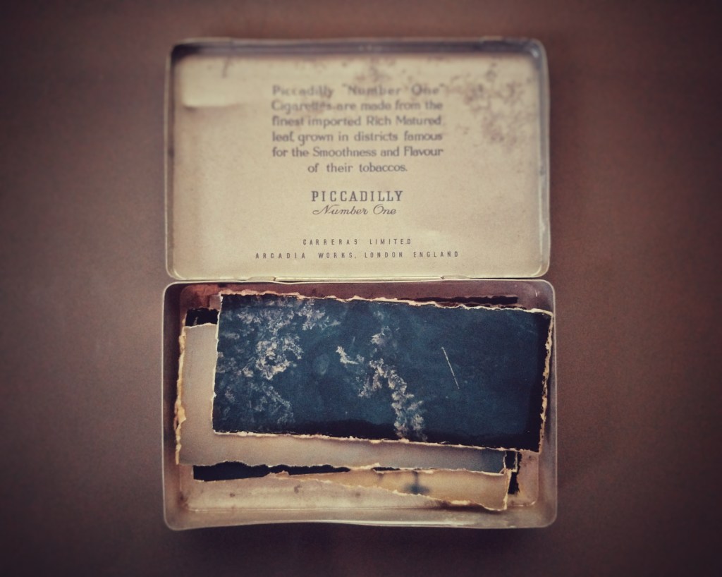 Update: After further researching the artist Masao Yamamoto I loved his technique to a) age the photos so as to make them individually timeless using tea and by keeping them about his person and regularly touching them to age them and b) his technique of displaying them unframed. When I printed my images I painted them with several layers of tea and when I then cut them out using a ruler/fold and then wet the edge of the crease before tearing to give a feathered uneven edge. In doing this I occasionally and accidentally scratched a couple of the images with a nail – it looked great, more worn already, more personal to me. I laid them out on some card but it didn’t look as I imagined what looked good in lightroom was no longer effective. I tried several layouts and thought I needed perhaps something bigger? or maybe smaller?? I suddenly said to my wife – do we have an old tobacco tin anywhere? Yes! she said. It was actually a decades old cigarette tin full of buttons – It looked great. I emptied the buttons and put the images in order in my hands and placed them in the tin. They were home. Just opening the lid makes me smile. The act of creating the images on paper was very tactile because of the printing, the painting and the tearing; and now to actually look at them was just as tactile for the viewer and adds history to the images with each viewing. Just as much as opening the lid makes me smile, closing the lid will remind me of completing the first year of the course.